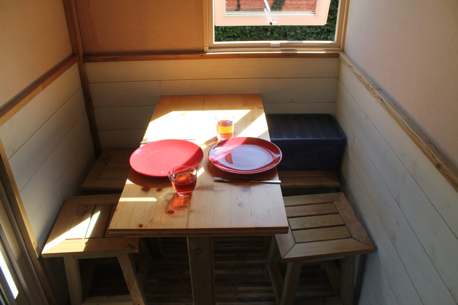 Het leuke aan dit huisje is dat je kunt kiezen of je beneden of boven slaapt. Boven bevindt zich een tent met twee eenpersoonsbedden waarbij je echt het kampeergevoel krijgt. Beneden een knus tweepersoonsbed vlakbij de WC en de douche, voor de minder enthousiaste kampeerder dus!
