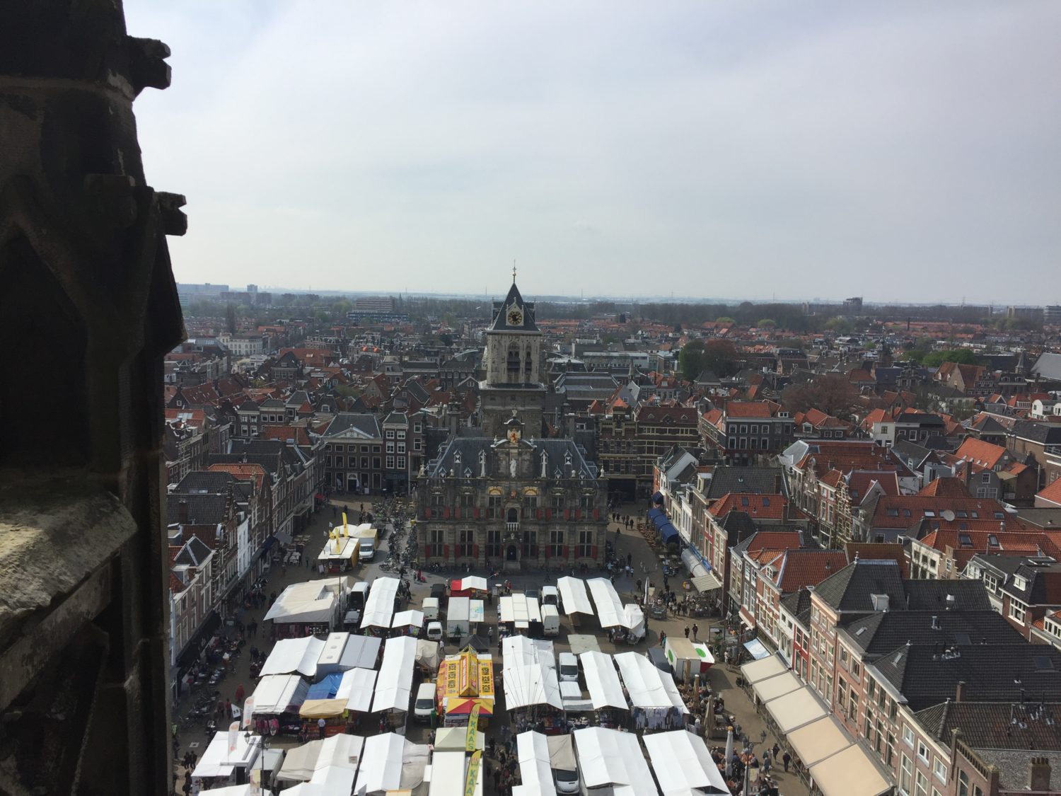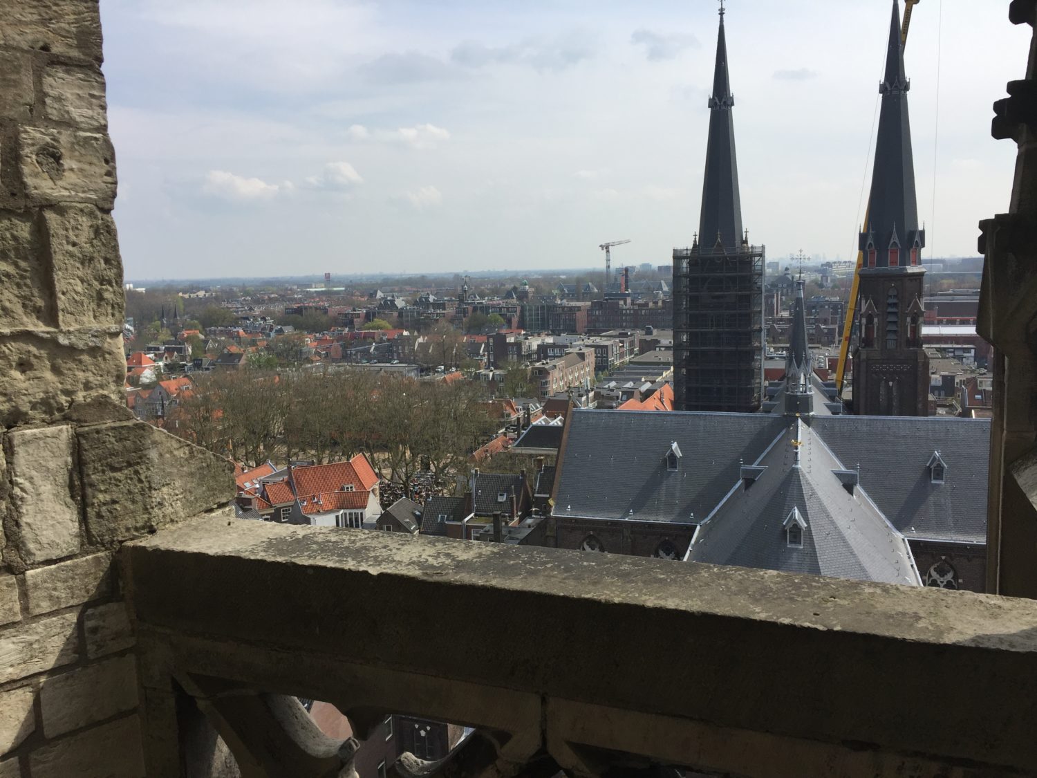 Halverwege kom je uit bij het gigantische klokkenspel van de kerk en als je alles gezien hebt en weer een beetje ben bij gekomen kun je jouw weg naar boven vervolgen. Eenmaal aangekomen bovenaan heb je een indrukwekkend uitzicht over de stad Delft en zijn gehele omgeving. Je kunt Den Haag, Rotterdam, Vlaardingen en Maassluis zien liggen op een mooie dag. Wat je ook kunt zien liggen is de Delftse hout, een recreatie gebied aan de rand van Delft. ’s Zomers is het hier gezellig druk met dagjes mensen. Je kunt er picknicken, barbecueën en lekker zwemmen in het grote meer. Het is ook een lekker gebied om te wandelen, joggen of fietsen.