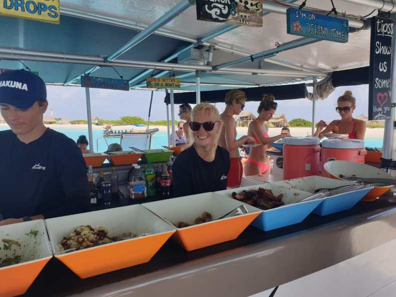 Tijdens een dagtrip naar Klein Curaçao met Blue Finn Charters wordt het eten aan boord verzorgd. Tussen de middag krijg je namelijk een heerlijke uitgebreide BBQ, die achter op de boot wordt bereid. Het is een lopend buffet dus je kunt zelf bepalen wat en hoeveel je eet. Erg fijn want iedereen heeft natuurlijk andere behoeftes. Daarnaast is ook de bar inclusief, je kunt dus de hele dag genieten van drinken. Zelf drink ik geen alcohol maar ook de alcohol is inbegrepen. Ik heb wel een paar kleine snacks zelf meegenomen mocht ik tussendoor trek krijgen maar eigenlijk heb ik daar helemaal geen gebruik van gemaakt. Overigens zijn er aan boord ook twee toiletten dus daar hoef je je ook geen zorgen om te maken.