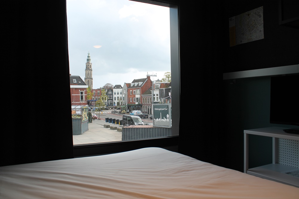 Wij hadden een kamer op de eerste verdieping dus kozen we voor de trap. Aangekomen in onze kamer hadden we meteen door dat we een super uitzicht hadden. De Martinitoren staat nog net niet in de kamer. Verder is de kamer ruim en beschikt over alle faciliteiten. De grote kast zorgt voor genoeg opbergruimte en je hoeft dus geen koffer op de grond te leggen. In de kamer vind je natuurlijk ook een televisie en heb je beschikking je over gratis WiFi.