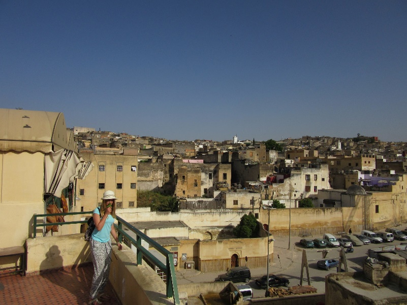 Het scootertje waar wij achteraan moesten rijden gebaarde dat we weer naar de kant moesten en stelde ons voor aan de ‘wild zwaaiende man’, die al voor ons geregeld bleek te zijn als gids. In mysterieus Marokko heerst een ‘vriendjescultuur’. Komen er toeristen en ga jij deze helpen? Dan maak je een deal met je maten zodat die ook van deze toeristen kunnen profiteren! Deze man bracht ons naar ons hostel, Happy Stay Fez, waar wij een heerlijk kopje muntthee aangeboden kregen. De muntthee staat symbool voor Marokko. Overal zie je mannetjes aan het eind van de middag voor hun huis sterk getrokken muntthee met suiker drinken. Ondanks dat ik nooit zoete thee drink, vond ik het erg lekker. De kamers in dit hostel waren fantastisch: traditioneel aangekleed met een balkonnetje in de kamer.