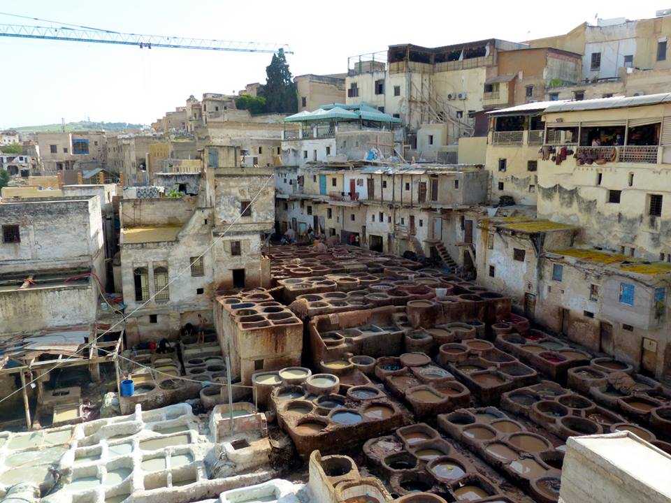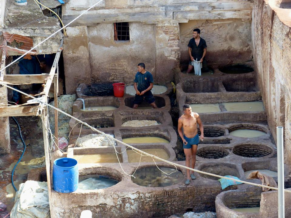 Na een tijd lang zigzaggen bereikten we één van de must-sees in de medina van Fez: de leerlooierij. Hier wordt leer nog altijd op dezelfde manier behandeld als in de middeleeuwen: de huiden van schapen, geiten, kalveren, paarden en dromedarissen worden in grote vaten soepeler gemaakt met vogelpoep en urine. Deze geur ruik je dan ook al van verre. Gelukkig krijg je van de gastheer een munttakje om onder je neus te houden, zodat je de geur tegen kunt gaan. Vervolgens maken ze de huiden schoon, stampen ze deze aan en kleuren ze ze rood, geel, blauw of groen. Na het bewerken worden de huiden op terrassen rondom de vaten gelegd om te drogen. Het was erg bijzonder en vooral bewonderingswaardig om te zien dat een groep mannen de hele dag in de volle zon dit werk deden.
