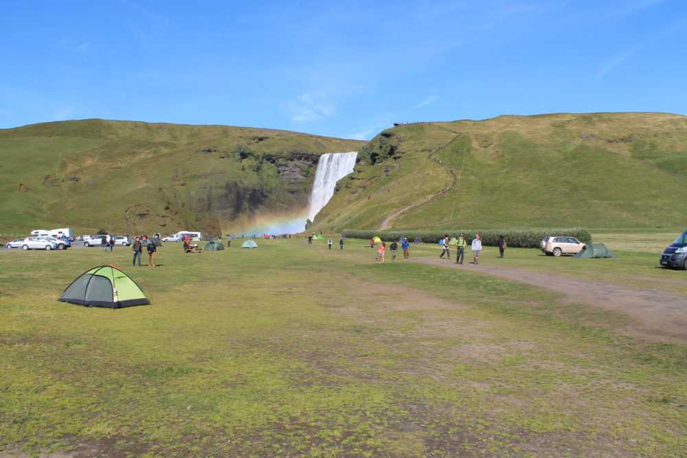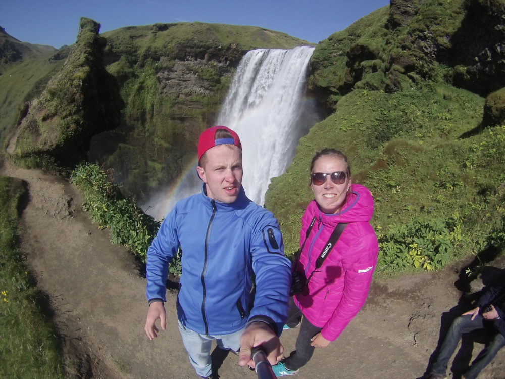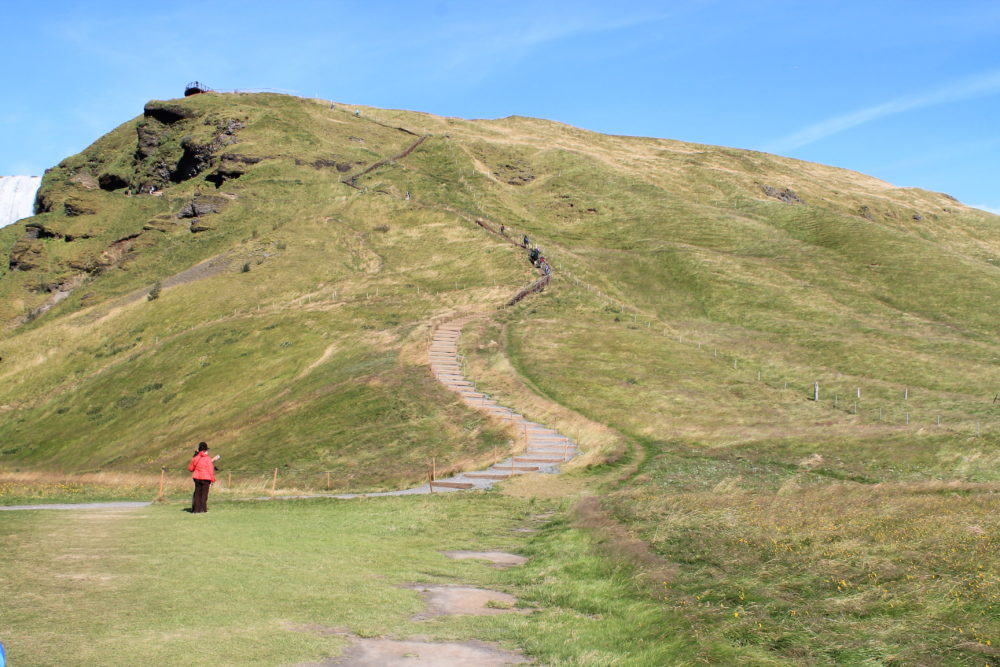 Bovenaan de trap heb je een uitzichtpunt. Dit plateau heeft een overhang over de waterval. Mocht je hoogtevrees hebben zou ik aanraden beneden te blijven. Het uitzicht is prachtig vanaf boven, wij hadden ook zeker geluk met het weer. Vanaf dit uitzichtpunt beginnen de meeste wandelroutes, die langs de rivier de Skógá lopen. Naast de weg naar het uitzichtpunt is er ook een klein “schapenpaadje” dat je nog dichter bij de waterval brengt. Hiervoor raad ik het wel aan om goede wandelschoenen met grip te hebben en rustig te lopen. Het is op dit stukje erg glad en smal dus je wilt geen risico lopen.