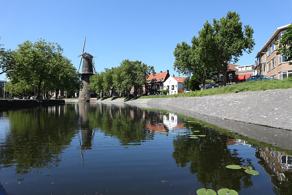 Je loopt via de Nieuwe Haven naar de volgende molen, molen de Drie Koornbloemen.