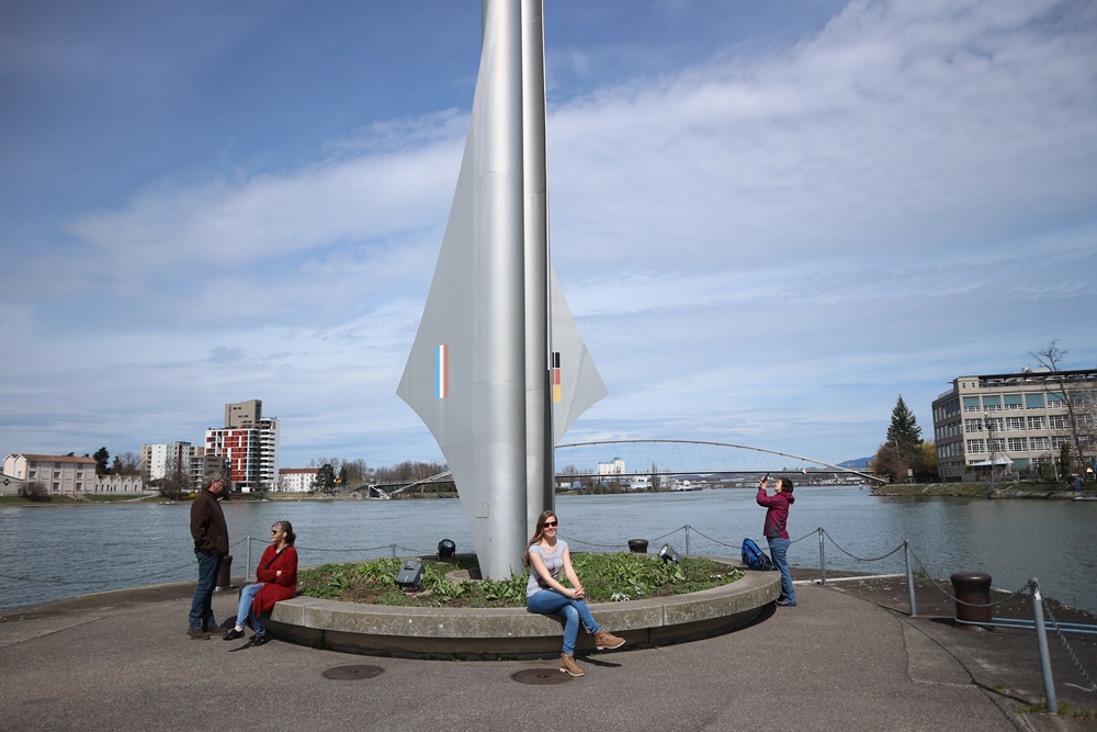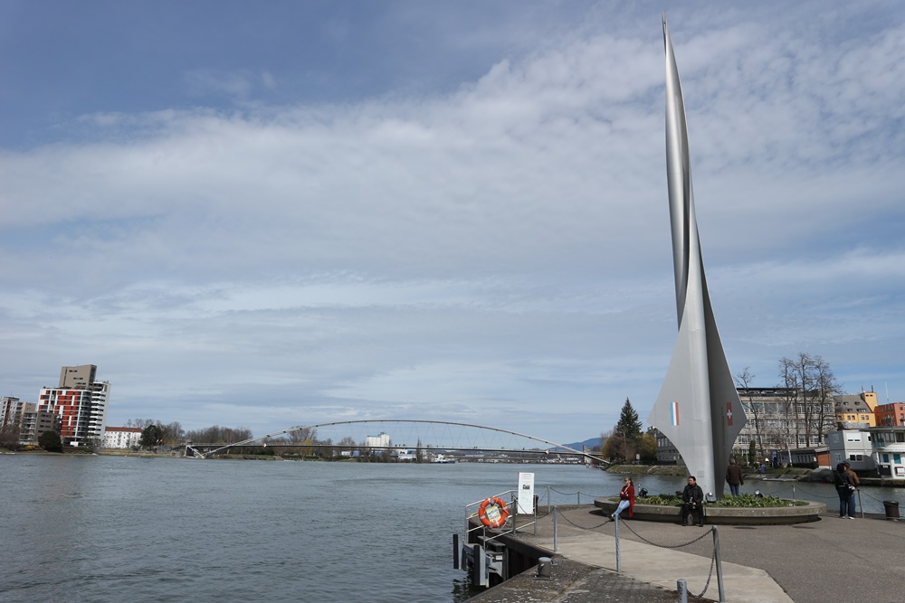 Wat te doen in Basel? Natuurlijk het Drielandenpunt bezoeken! De stad ligt namelijk op de grens van Frankrijk, Zwitserland en Duitsland. Het is eventjes zoeken maar het is wel erg leuk om het Drielandenpunt te bezoeken. Wij hebben in Nederland ook een Drielandenpunt natuurlijk, maar dit is een totaal ander soort plek. Het is rustig en er zijn bijna geen toeristen. Officieel ligt het punt midden in de Rijn maar het beeld staat op de oever van de rivier.